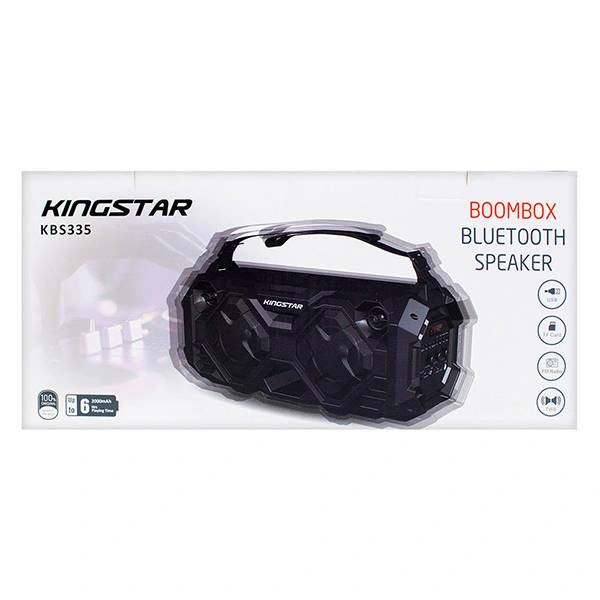 اسپیکر KBS335 کینگ استار تولید شده توسط « کینگ استار» (kingstar) است که این شرکت کمپانی ای به نام در شرق آسیا می باشد، در بازار جهانی و همینطور ایران عرضه گشته است. این روزها نیاز به یک اسپیکر قابل حمل در هر خانه ای و یا در بین لوزام هر فردی احساس می شود. شاید شما تصمیم به برگزاری مهمانی در خانه داشته باشید و یا همراه دوستانتان به یک کمپ بروید. همراهی موزیک در هر جمعی نقطه عطف به حساب می آید زیرا پخش یک آهنگ شاد و یا ملایم میتواند هیجانات را بیشتر کند. اسپیکر KBS335 کینگ استار از سری بوم باکس کمپانی کینگ استار به شمار می آید و دارای طراحی بسیار جذاب، مدرن و جوان پسند است. خروجی اسپیکر های آن به صورت پنجره هایی لوزی شکل طراحی شده است و صفحه کلید کنترل آن در قسمت کناری اسپیکر قرار گرفته است. همچنین برای آسانی در حمل و نقل بندی با استحکام بالا بر روی آن قرار دارد که می توانید برای مثال هنگام کوه نوردی اسپیکر را بر روی شانه خود آویزان کنید و نگران سختی حمل و نقل آن نباشید. بر روی صفحه کنترل این اسپیکر یک صفحه LED کوچک قرار دارد که می توانید از طریق آن هنگام مود رادیو کانال یابی کنید و یا شماره ترک مورد نطرتان را جستجو کنید. در این قسمت سه کلید چرخشی نیز وجود دارد که هر یک برای تنظیم صدای اسپیکر، صدای میکروفون و میزان اکو استفاده می شوند. از آنجایی که این محصول دارای سوکت میکروفون نیز هست میکروفون خود را به آن متصل کنید و خروجی صدای آن را تنظیم کنید. پورت USB به شما امکان اتصال فلش مموری خود به دستگاه را می دهد و پورت TF آن شما را از یک دستگاه پلیر کارت حافظه دار بی نیاز می کند. درست است که از نقاط عطف این محصول وجود قابلیت اتصال بلوتوثی در آن است ولی به کمک درگاه AUX آن در صورتی که پلیرتان بلوتوث را پشتیبانی نمی کند می توانید با یک کابل AUX به آن متصل شوید. بوم باکس بلوتوثی کینگ استار مدل KBS335 دارای ابعاد 46x20x21 است و وزنی معادل 2.92 کیلوگرم را داراست. ظرفیت باتری به کار رفته در آن 2000 میلی آمپر ساعت می باشد، توان خروجی آن 2x12W است و 2 بلندگوی 4 اینچی را داراست. در صورتی که می خواهید از این اسپیکر در جشن های خود استفاده کنید، می توانید آن را با اسپیکر همنام دیگر سینک کنید و با آهنگ خود شعاع بیشتری را پوشش دهید.